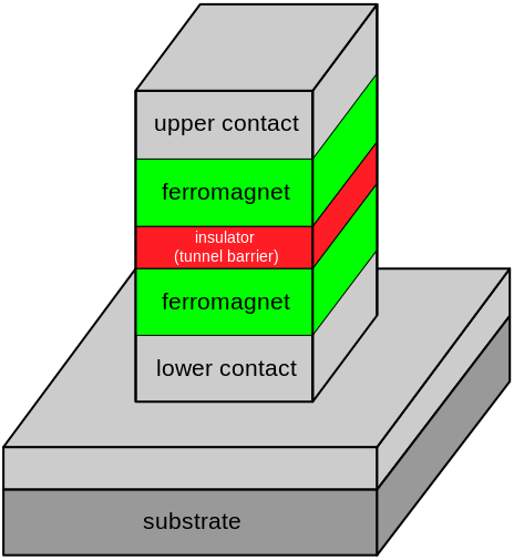 其中,最值得关注的是穿隧磁阻效应。它是指在铁磁-绝缘体薄膜(约1纳米)-铁磁材料中,其穿隧电阻大小随两边铁磁材料相对方向变化的效应。此效应首先于1975年由 MichelJulliere 在铁磁材料(Fe)与绝缘体材料(Ge)发现。然而,室温穿隧磁阻效应则于1995年,由 TerunobuMiyazaki 与Moodera 分别发现。此效应更成为了磁阻随机存取器与硬盘中的磁性读头的科学基础。
