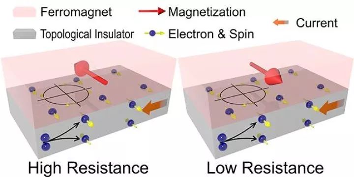 下图是磁阻效应的示意图。电子自旋在拓扑绝缘体中产生。那些处于铁磁体和拓扑绝缘体接口处的电子自旋与铁磁体产生交互作用,从而为设备带来高电阻或者低电阻,这一点取决于磁场和自旋的相对方向。