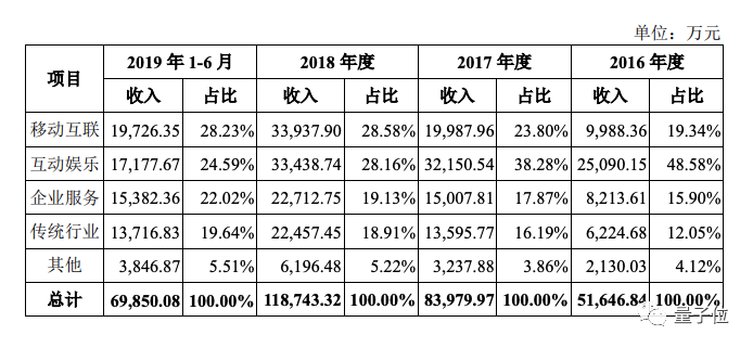 客户相对集中,主要来自于互联网领域,其中移动互联、互动娱乐行业占比52.82%,其次是企业服务,占比22%;传统行业占比19.64%,虽然与往年有所提升但非常微弱。