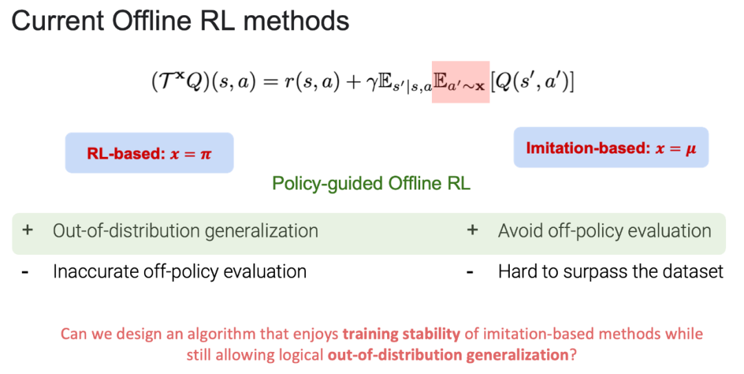 在利用贝尔曼策略评估算子进行策略评估时,根据 X 的不同可以把当前的离线强化学习算法分为 RL-based (x=π)和 Imitation-based (x=μ), 其中π为目标策略,μ为行为策略 (注:目标策略:进行学习更新的策略;行为策略:离线数据中的策略)。当前,不管是 RL-based 还是 Imitation-based, 都有各自优势以及劣势: