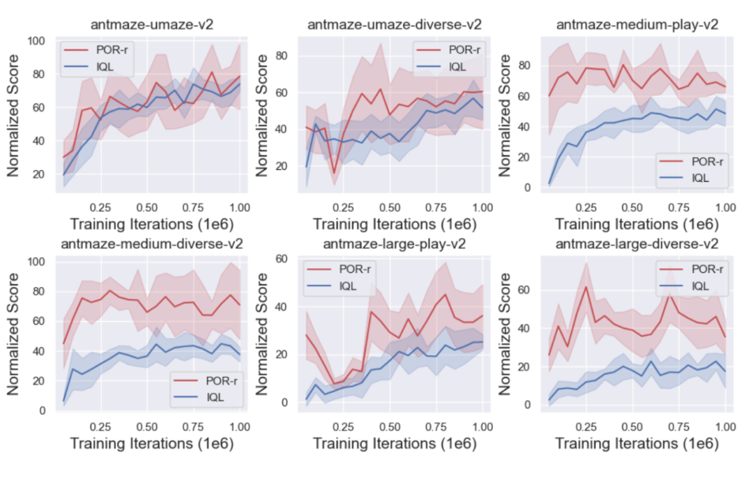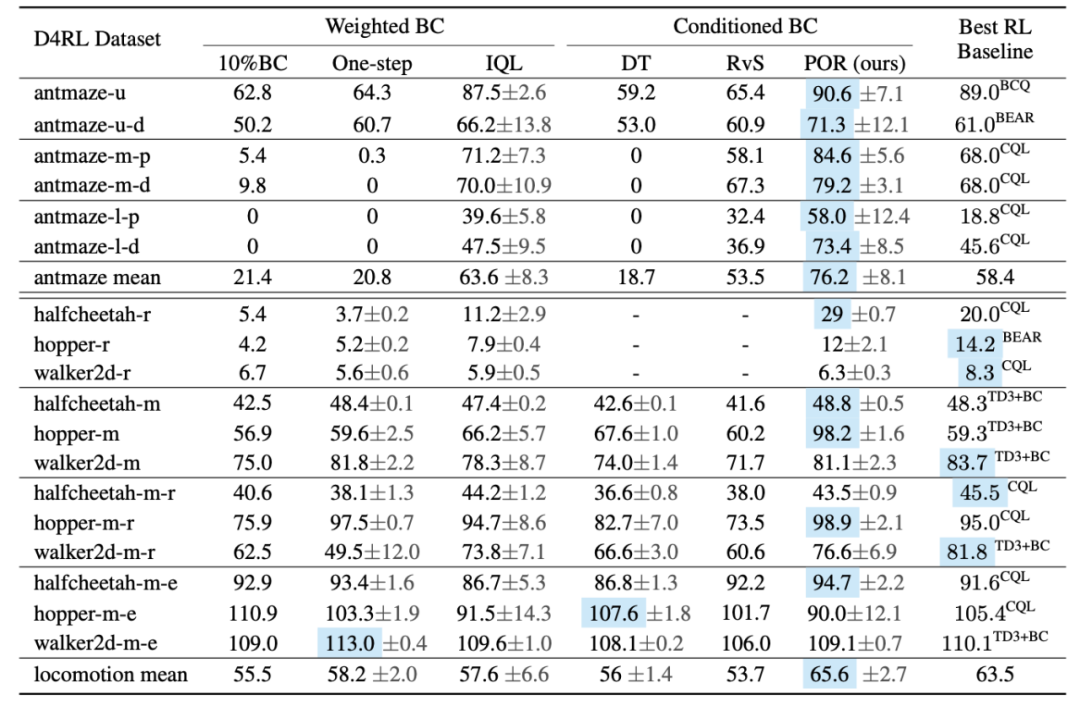 作者对比了 POR 和其他算法在 D4RL Benchmark 上的表现。从表格来上看,POR 在次优数据上的表现非常亮眼,在具有更大难度 Antmaze 任务上的表现均取得最优的算法性能。