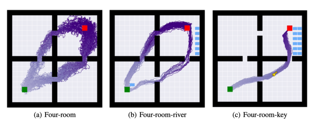 为此,作者提出了三个任务分别是 (a): four-room: 要求 agent 从绿色方块到红色方块。(b) 除了完成任务(a) 之外,要求 agent 不能触碰河流。(c)除了完成任务(a),(b)之外,要求 agent 必须获得钥匙才算完成任务。
