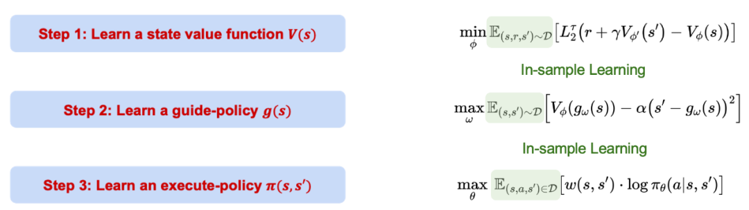 Policy-guided Offline RL (POR)的学习过程分为三步,这三步是分别解耦的,互不影响。值得注意的是,POR 全程都是基于 imitation-based 的学习,也就是样本内的学习(in-sample learning),不会对数据分布外的动作进行价值评估。
