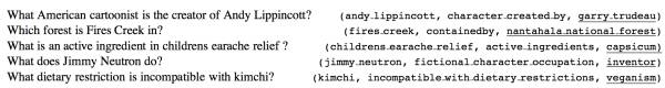这篇论文初步尝试了将记忆网络应用于KB-QA中。作者认为现在的KB-QA对于解决只依赖一个知识三元组的简单问题(称为 Simple Question Answering)仍然有困难,为此作者构建了一个更大的简单问题数据集,称作SimpleQuestions。该数据集的每个问题都依据一个知识三元组知识,进行人工构建问题,数据集最终一共包含了108,442个问题-答案对,相比之前只含8000多个问题-答案对的benchmark数据集WebQuestion,其数据量大了很多。该数据集的部分数据如下图所示(下划线表示答案):