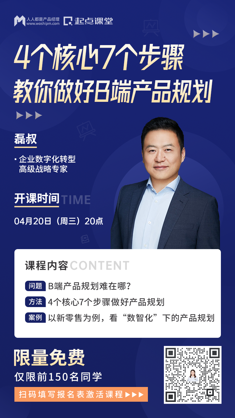 为了帮助B端产品经理解决在B端产品规划方面的问题,人人都是产品经理社区&起点课堂准备了一场B端产品经理公开课。