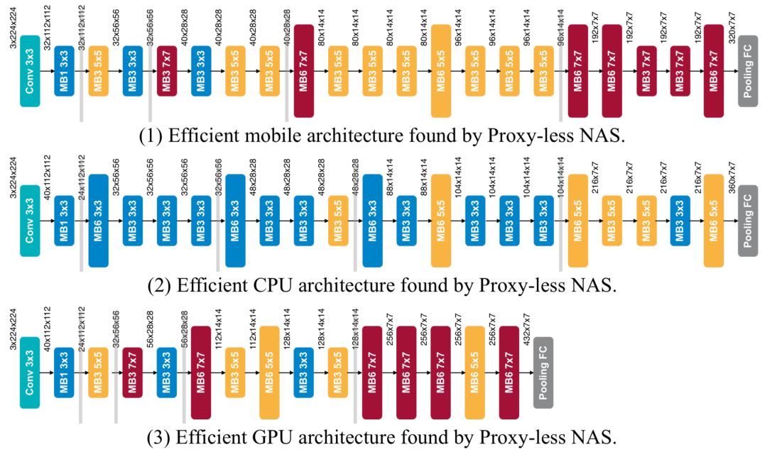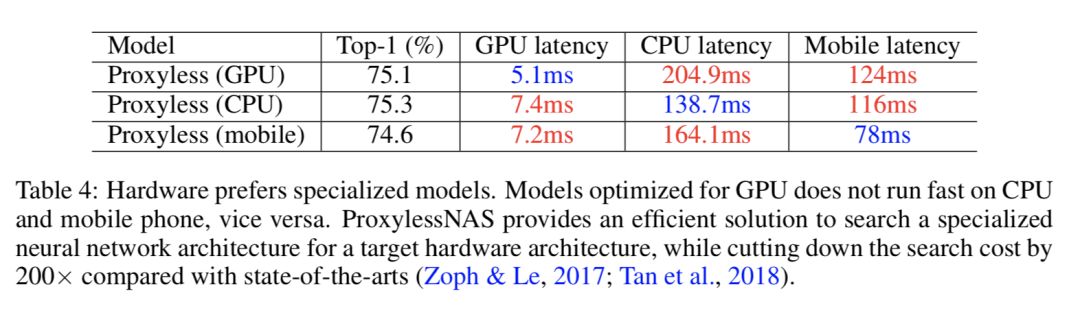 我们提出了一种新的基于梯度的方法(作为一个正则函数),来处理硬件目标(例如延迟)。针对不同的硬件平台:CPU / GPU / FPGA / TPU / NPU,ProxylessNAS 实现了针对目标硬件 CNN 结构定制。据我们所知,这是第一个来研究不同硬件结构下的专用神经网络结构的文章。
