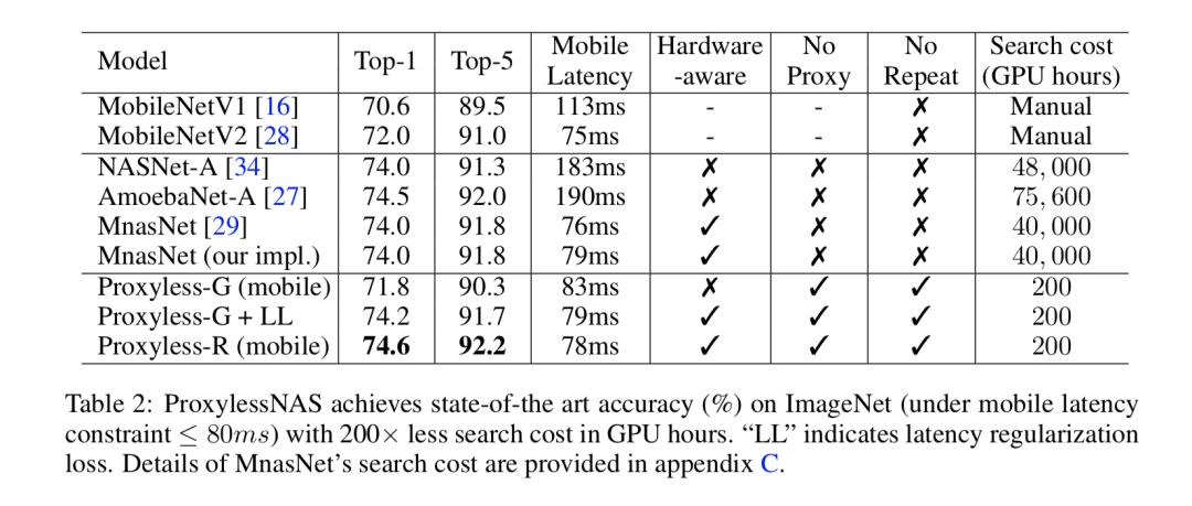 ProxylessNAS 是第一个在没有任何代理的情况下直接学习大规模数据集(例如 ImageNet)上的 CNN 结构的 NAS 算法,同时仍然允许大的候选集并消除重复块的限制。它有效地扩大了搜索空间,实现了更好的性能。