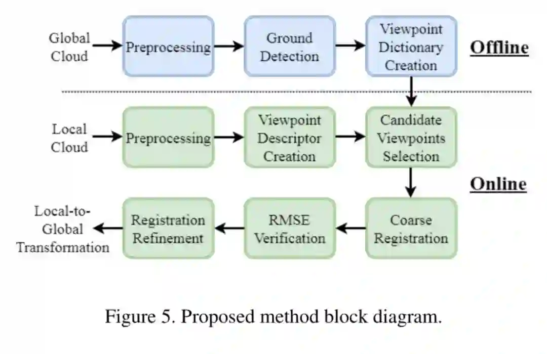 因此我们基于最近提出的将全局点云转换为基于视点的点云词典的方法进行了改进。我们提出了一种局部到全局的配准方法,用视点描述子替换点云字典,包括全景范围的图像。然后,我们利用相位相关在离散傅立叶变换(DFT)域中的作用进行有效的字典搜索,以快速找到从局部参考帧到全局参考帧的合理变换。本文的方法框架如下图。
