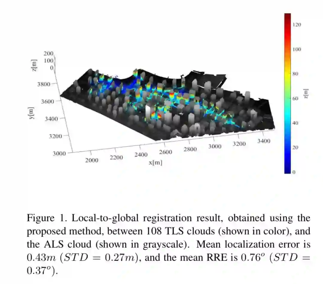 由于局部点云与全局点云的数据之间存在实质性差异,且用于获取它们的技术不同,因此局部到全局的点云配准是一项具有挑战性的任务。全局点云覆盖大尺度环境并且通常需要从空中俯视获得,例如使用机载激光扫描(ALS)对城市进行3D建模。作为对比,局部点云则通常从地面获得,并且范围相对更小,例如使用地表激光扫描。他们之间的差异通常表现在点密度分布,遮挡和噪声测量中。由于存在这些差异,现有的点云配准方法如基于关键点的配准往往会失败。