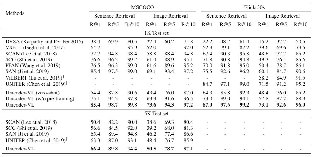 1)图像文本检索。我们选取 MSCOCO 数据集和 Flickr30k 数据集,并分别从图片检索文本和文本检索图片这两个角度评估 Unicoder-VL 在图片检索上的能力。由于预训练数据与这两个图文检索数据集之间的差异,需要在这两个数据集上进行一定程度的微调。所用到的数据构造则与预训练任务3)保持一致:即随机采样负例图片(或文本),让模型判别两者是否匹配。