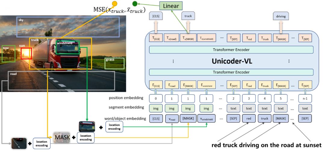 4)图像特征生成。该任务为每个遮挡的图片区域生成一个特征向量。通过拟合该向量和图片区域对应的原始图像特征向量,使得模型能够更好地根据图文上下文信息进行图像信息补全。