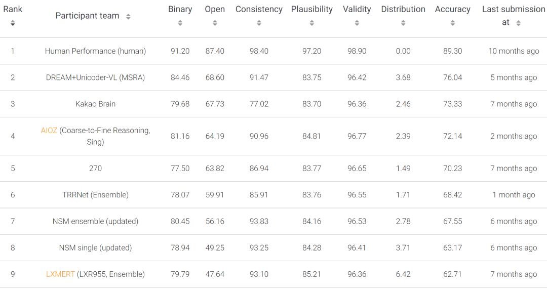 针对该任务,我们设计了一个基于 Unicoder-VL 的视觉问答推理模型(DREAM+Unicoder-VL)。该模型首先使用 Unicoder-VL 将输入自然语言问题和图片转化为对应的向量表示。然后,基于语义分析技术,将自然语言问题转化为对应的树结构语义表示,基于物体识别技术,从图片中抽取物体候选,并使用常识知识库对每个物体候选进行常识知识三元组扩展。接下来,对问题对应的语义表示和常识知识三元组集合进行向量编码,并结合 Unicoder-VL 输出的向量表示进行跨模态注意力计算。最后,基于融合后的跨模态混合信息进行答案排序。图3 给出该方法在 GQA 任务排行榜上的结果(截止到2020-01-10)。