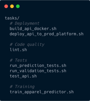 这就是项目中所有的脚本放的地方。这包括检查代码质量的测试、模型预测的测试、部署任务、训练任务等等。