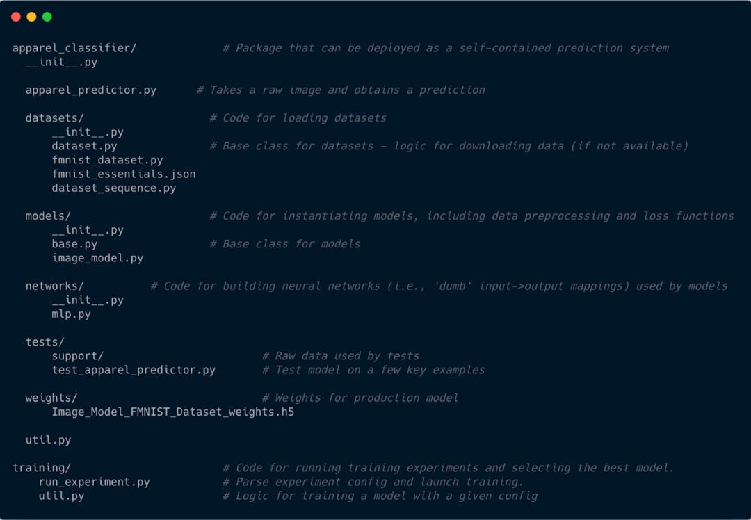 你可以看到结构中有两个单独的目录—一个包含构建模型所需的所有部分,另一个实际上根据一组模型配置来训练模型。注意模型和网络之间的区别。这是因为神经网络在这里被认为是一个dummy函数,它只有神经元节点,但它不知道如何操作——如何加载数据,如何向前传递,如何产生预测等等。驻留在models中的脚本负责这一点。