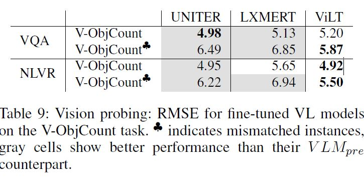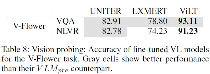 Fine-tuning改善了UMITER和LXMERT的视觉性能。这似乎表明VQA和NLVR依赖视觉信息,而这些信息在预训练模型中不容易获取,同时也表现出两个模型在提取视觉信息上的不足;另一方面Fine-tune并没有提高ViLT提取视觉信息的能力。