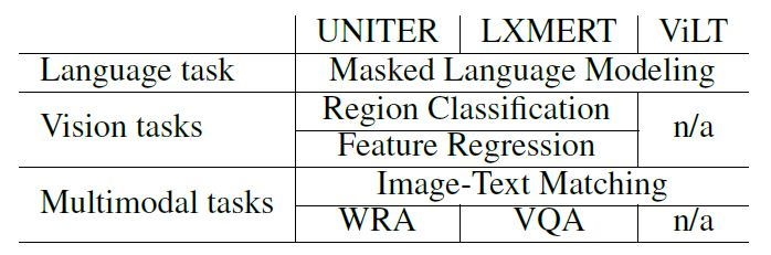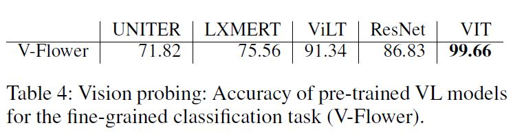 作者选择了三种不同架构且已经预训练好的视觉语言模型:UNITER,LXMERT,ViLT在不同的探索任务上与单模态的SOTA模型进行对比: