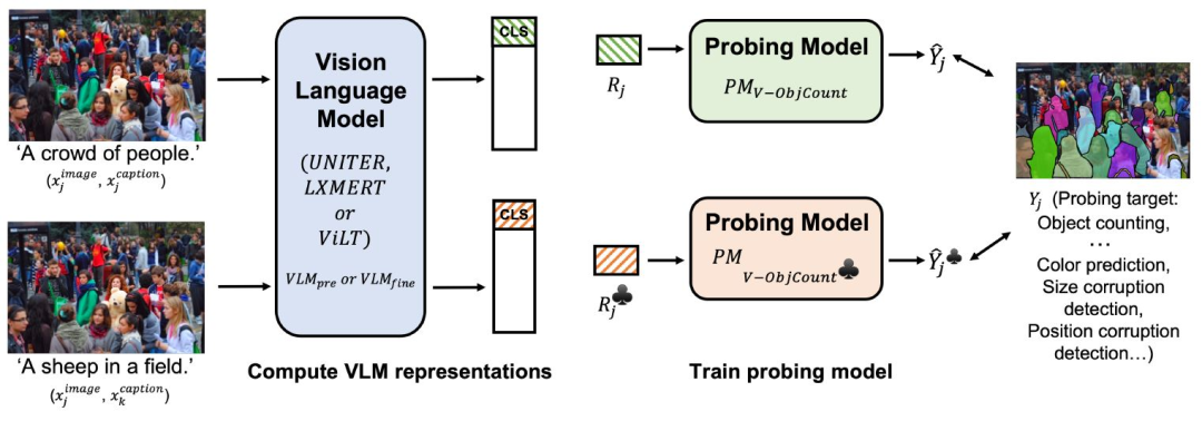 首先将图文匹配和图文不匹配的图文对分别输入到预训练的视觉语言预训练模型 或是fine-tune后的模型 ,得到数据对应的模型最后一层表征;将得到的[CLS]或是WORD级别的token表征 输入到一个未在数据集上训练的线性探测模型 (只能依赖模型在预训练或是fine-tune阶段已经提取到的线性可分离信息)用于反应VLM提取到探索任务p所需信息的能力。