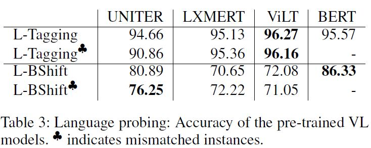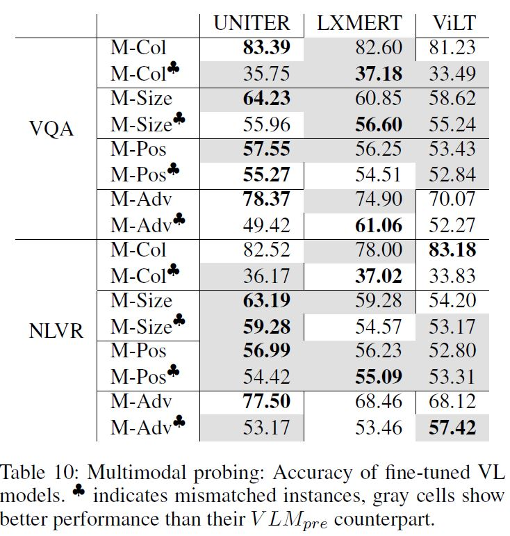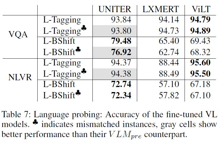 在语言任务上,唯一有提升的是UNITER在负例上的表现,作者将其归结于该模型预训练协议的特殊性。而在NLVR任务上fine-tuned的模型表现出更低的性能可能是因为NLVR任务使用两张图片作为输入,和预训练、探索任务不同;LXMERT经过fine-tuned的性能体现出该模型更容易忘记在预训练阶段学习到的语义知识。