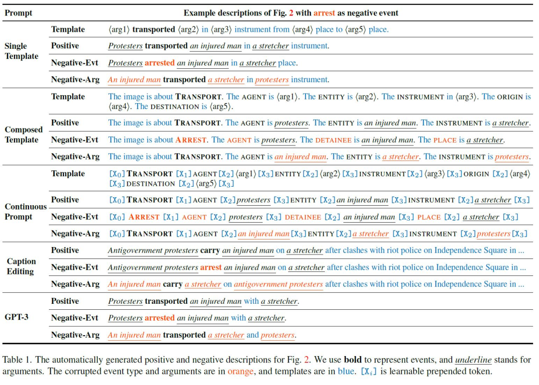 描述生成:为了对提取到的事件结构以及负例事件结构进行encoding,作者设计了多种prompt函数(此处给出生成的例子)