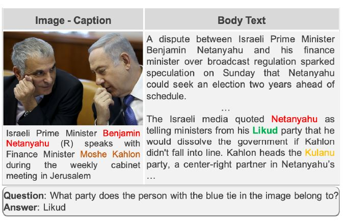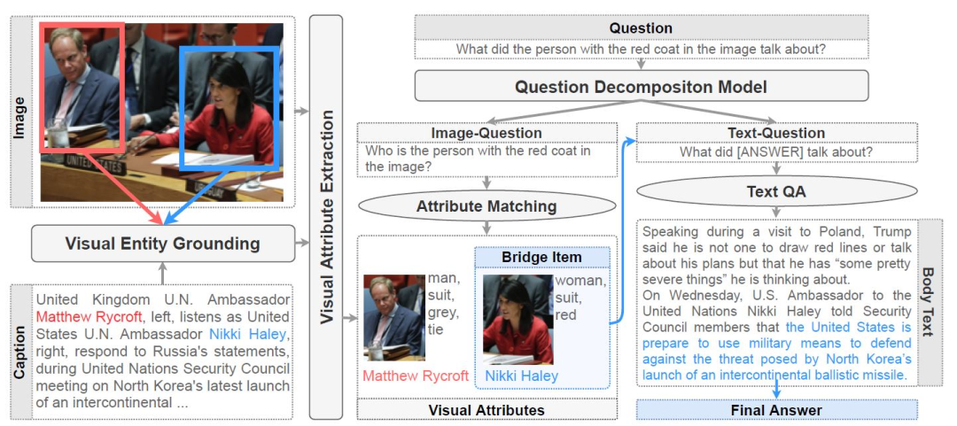 给定带有图像-标题对以及问题的新闻正文,系统需要在正文中找到相应的文本跨度来回答问题。回答问题的过程中,系统需要进行多跳推理:首先进行图片-标题对之间的grounding为与问题中图片相关的部分找到中间答案,称为桥项(bridge item);第二跳是通过中间答案在新闻正文中进行推理,提取文本跨度作为最终答案。例子如下: