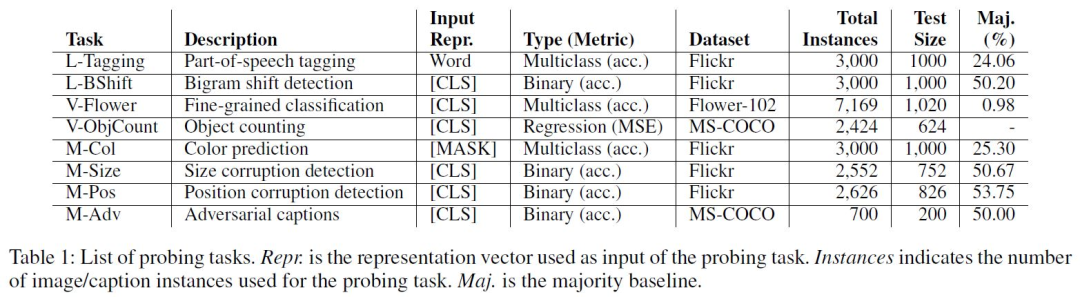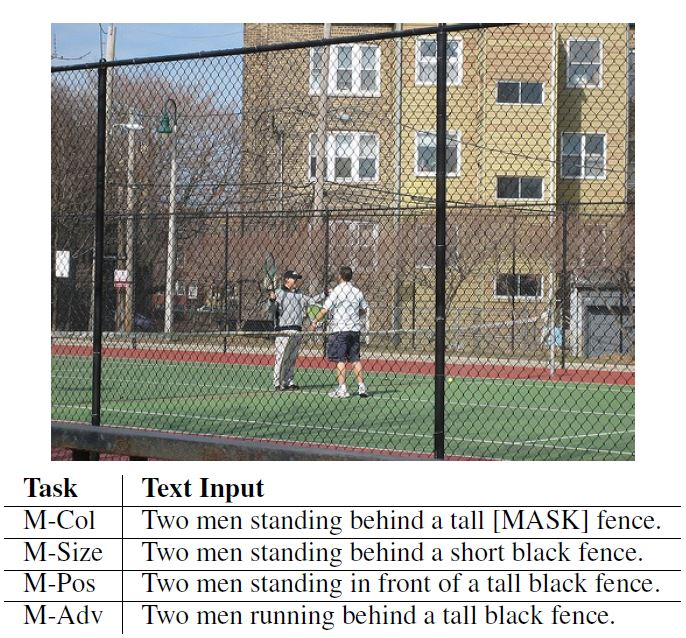 探索任务主要分语言、视觉以及多模态三部分进行:语言探索任务包括Part of Speech Tagging(对token进行语义分类,数据集通过en core web sm SpaCy tagger进行构建)、Bigram Shift(确定一个句子中连续的两个词是否被调换);视觉探索任务为Flower identification和Object Counting;在多模态探索任务上,作者主要在描述对象的概念属性方面进行,设计了颜色、大小、位置识别以及Adversarial captions任务并构建了相应的数据集进行评估,以下是“Two men standing behind a tall black fence”在各任务上修改后的caption负例展示。