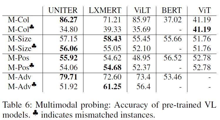 视觉语言任务(如视觉问题回答、跨模态检索或生成)非常困难,因为模型需要建立合理的多模态表征将文本和图片的细粒度元素联系起来。在BERT等基于transformer的语言模型成功后,各种基于transformer的多模态预训练模型(如LXMERT、OSCAR、ViTL等)被提出用于得到文本-图片的多模态表征,并且在多模态任务上达到SOTA。但重要的是要了解多模态信息是如何在这些模型学到的表征中编码的,以及它们是如何受到其训练数据的各种bias和属性影响的。Hendricks & Nematzadeh依靠探索任务来研究多模态预训练模型对动词的理解,并确定模型对动词相关的多模态概念的学习少于主语和宾语的学习。在本文中,作者通过特定的一组探索任务来探究VLM的多模态表征能力以及对单模态信息的偏向性。