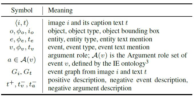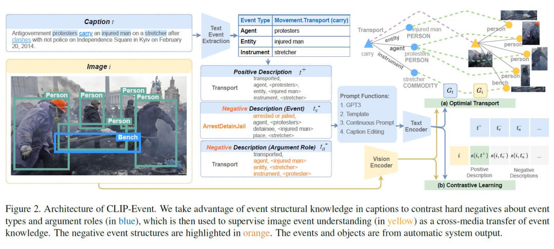 首先,使用Faster R-CNN提取图片中的Objects;对Caption使用SOTA的信息抽取系统提取事件并确定基本事件类型(如果存在多事件,图像更通常地描述了标题的主要事件;选择更接近依赖性解析树、有更多Arguments、更高事件频率以及在CLIP下动词和图片有更高相似度的事件作为基本事件)。然后框架根据提取到的事件类型设计两类Caption负样本(改变事件类别或只改变事件Arg顺序),并根据prompt函数生成结构事件的描述。通过优化图片事件图和正例事件图之间的最优传输距离以及正负样本与图片的相似度来达到多模态信息融合。以下介绍相关细节: