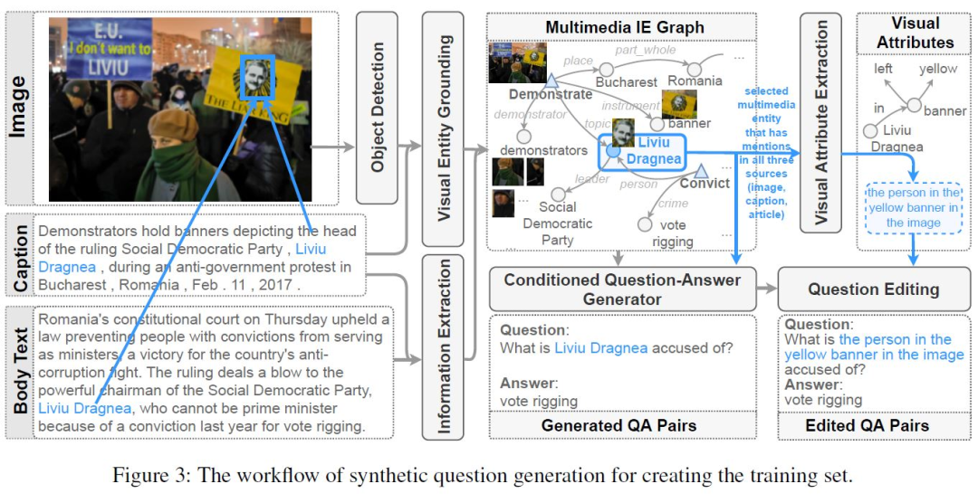 首先通过图片-Caption对之间的Grounding获得图片中Object在Caption中的描述,并对Drounded的图片Object运用视觉属性抽取系统提取相应的视觉属性以便生成对Object的描述。在得到Caption中Grounded的实体之后,先使用SOTA的知识抽取模型对Caption和正文进行相应的实体提交抽取以获得候选的上下文来进行问题-答案对生成。使用带视觉属性的图片Object的描述来替换生成的问题中的Grounded实体对应的文本跨度。最后过滤掉能够被单跳纯文本QA模型回答的数据。