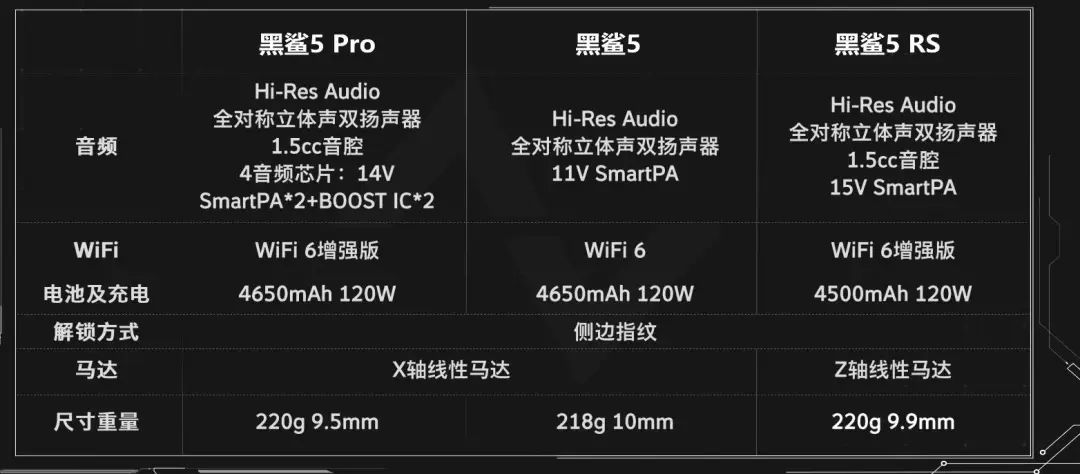 黑鲨 5 系列这次一共发布了三款产品黑鲨 5 Pro、黑鲨 5 以及黑鲨 5 RS 这三个型号,除了处理器不同之外,在一些细节上也有所差异。具体参数大家可以看图。这次咱们聊的主要是黑鲨 5 Pro。