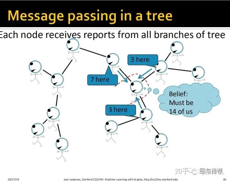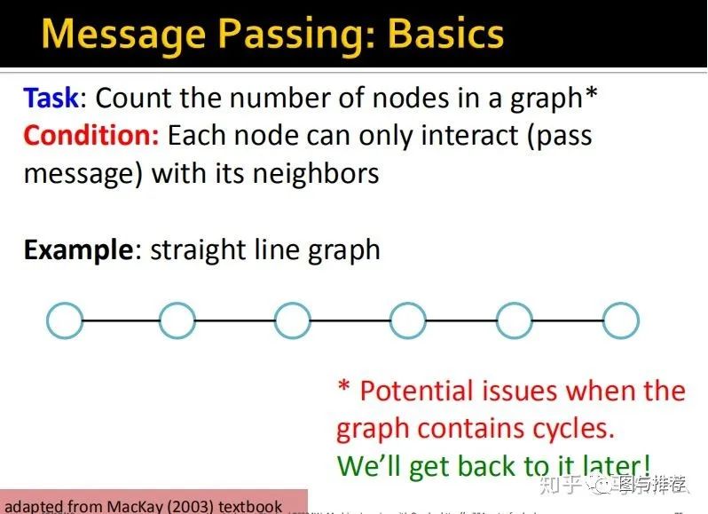然而,普通的 belief propagation 无法处理存在cyclic(循环)的情况,这也很好理解,比如上图我们在两个节点之间又加入一条连线,这个时候就没法计算全部节点的数量了。