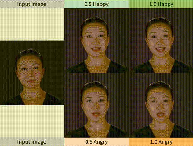 此外,可以使用情绪标签调制潜在关键点,以改变表情强度或控制注视方向。