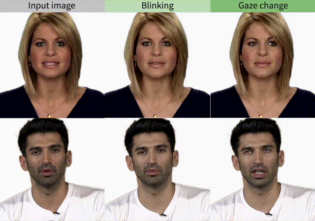 首先,它允许对输出面部表情(比如眨眼或特殊的头部姿势)进行细粒度控制。例如,可以修改面部特征点,以引入眨眼或其他头部姿势,来输入特定的姿势或预测姿势。