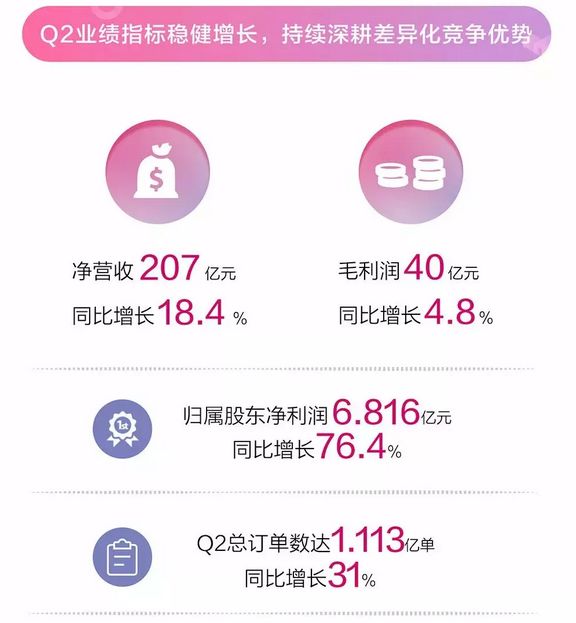 8月14日,唯品会发布了2018年二季度财报。财报数据显示,净营收同比增长18.4%至207亿元,归属股东净利润为6.816亿元,同比增长76.4%,这是唯品会连续实现23个季度连续盈利,另外,订单数为1.113亿,同比增长高达31%。