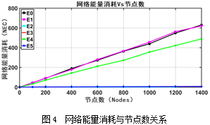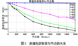 通过仿真图可以看出:在E2、E3、E5中,随着节点数的增加,网络的数据包获取率、数据包碰撞率、网络能量消耗的变化较小,网络性能较好;在E0、E1、E4中,随着节点数的增加,网络的数据包获取率、数据包碰撞率、网络能量消耗的变化幅度较大,网络性能较差。LoRaSim对无线传感器网络模拟部署,对配置参数进行优化,获得无线传感器网络的数据包获取率、数据包碰撞率、网络能量消耗参数,评估网络性能,满足低功耗广域物联网的覆盖性能要求。LoRaSim通过软件模拟仿真的方式,避免了真实环境下的无线传感器网络大规模铺设,满足了无线传感器网络多种参数配置和按需拓扑的要求。