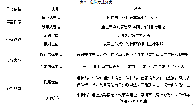 在无线传感器网络中,根据不同的分类指标可以将定位方法分为不同种类型[14],具体分类结果如表2所示。