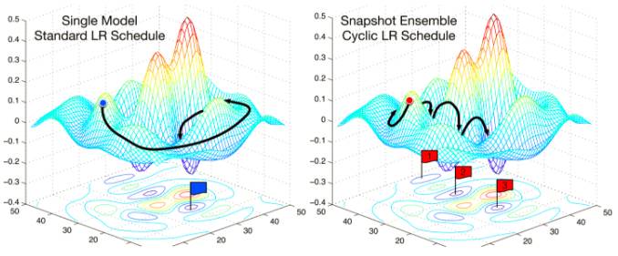快照集合(Huang et al., 2017)是一个最近提出的非常巧的方法,它使用热启动组装成一个整体,当训练单模型时不用额外的代价。这种方法可以训练一个单模型,按照我们之前看到的余弦衰减时间表收敛,然后保存模型参数,并进行热重启,重复这一个步骤M次。最后,所有保存的模型快照形成一个集合。从图2可以看到常用的随机梯度下降优化过程的错误曲面与快照集合过程的对比。