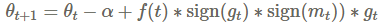 α是一个超参数,往往设置为e或者2. 函数f(t)设置为1或者衰减函数(线性、循环或者随着时间t衰减),m^t是过去梯度的滑动平均。通常设置为α=e,且无衰减。我们注意到,这个更新分别缩放梯度为,依赖于梯度的方向与滑动平均的角度是否一致。这说明这种类似动量的过去梯度与现在梯度的一致性是用于优化神经网络模型优化的重要信息。