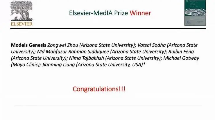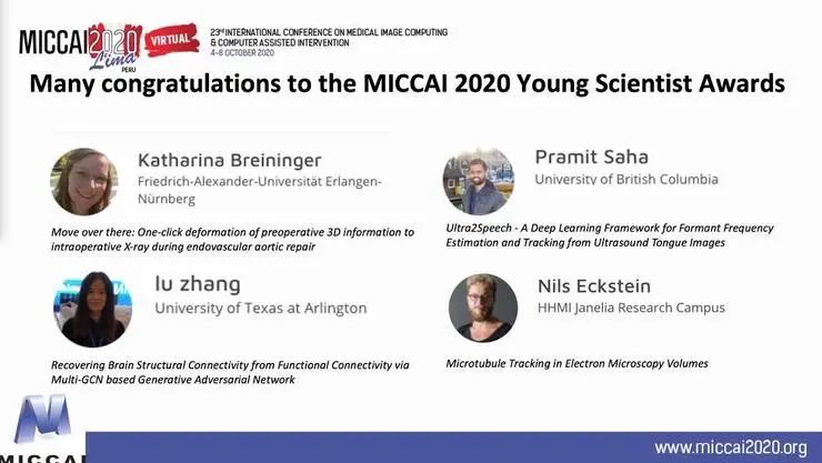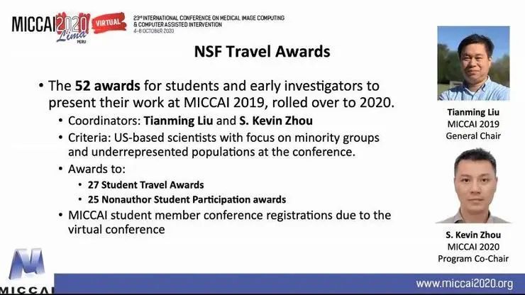 随后,MICCAI持久影响力奖等多个学术成就奖也相继颁发,其中沈定刚的博士生聂栋今年荣获Young Scientist Publication Impact Award。