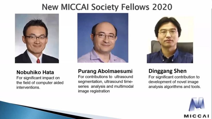 当选者需经过严格而保密的选举流程——至少同时有两位现任Fellow支持的MICCAI协会会员才可获得候选人资格,再由所有现任MICCAI Fellows从候选人中投票选举产生本届Fellow。今年,沈定刚与美国哈佛大学的Nobuhiko Hata及加拿大不列颠哥伦比亚大学的Purang Abolmaesumi共同当选。