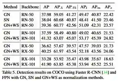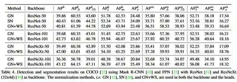 最后的结论是GN+WS可以在micro batch(1~2images per GPU)的条件下,匹配甚至超越BN在large batch size下的性能。