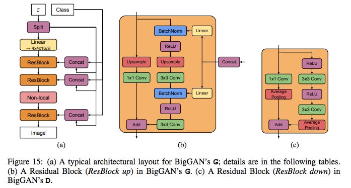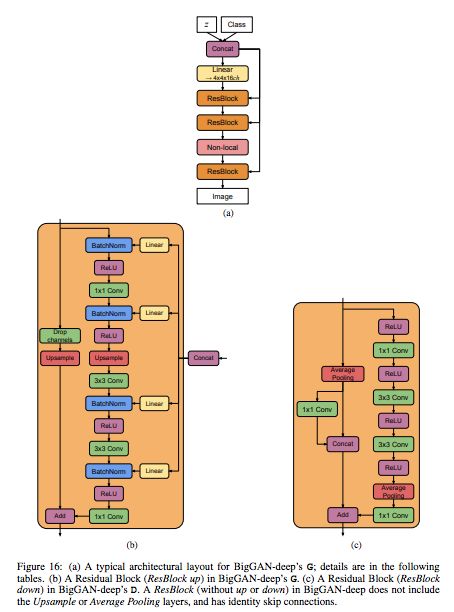 目前,这篇论文已经出了更新版,模型架构也有所改进,新版模型名为 BigGAN-deep,从名字中我们可以猜测出二者在深度方面似乎有所区别。
