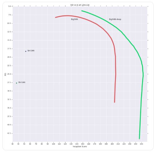 BigGAN-deep 与 BigGAN 在 128×128 图像上的 IS 和 FID 对比。
