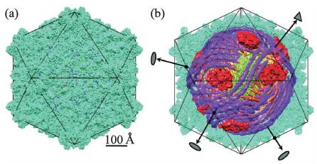 图4 利用衬度分离方法得到对称失配情形下的病毒颗粒结构(a)外部的衣壳结构;(b)内部的基因组结构