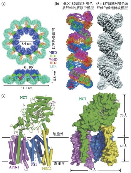 图2 我国在冷冻电镜领域中获得高质量的研究成果(a)近原子分辨率的炎症复合体结构(图中NBD为核酸结合结构域,HD1 为螺旋结构域-1,WHD为翼螺旋结构域,HD2 为螺旋结构域-2,LRR为亮氨酸重复序列);(b)30 nm 染色质左手双螺旋高级结构;(c)3.4 Å 的人源γ 分泌酶复合物结构(图中NCT是一种I 型单次跨膜糖蛋白,APH-1 为前咽缺陷蛋白-1,PS1为早老素-1,PEN-2 为早老素增强子-2)