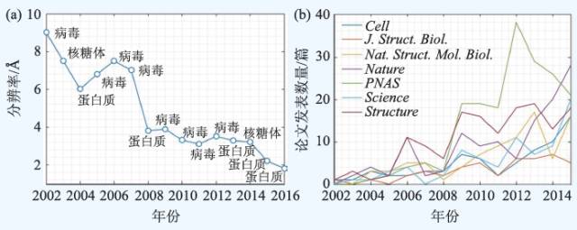 图1 冷冻电镜技术和单颗粒重构技术越来越备受关注(统计数据来源于EMDataBank )(a)不同年份中利用冷冻电镜单颗粒重构技术能够达到的最高分辨率;(b)通过冷冻电镜技术进行的研究成果在不同杂志上发表的论文数