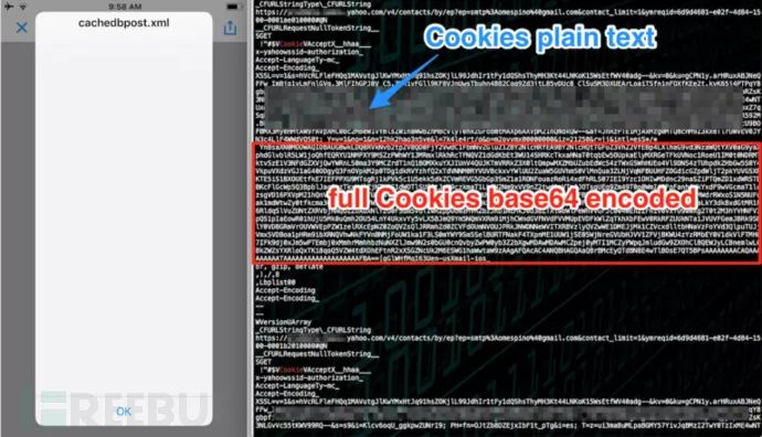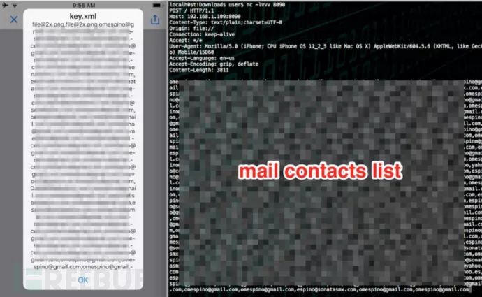 后来有一天,我突然想到了一种提升漏洞利用且安全无害的方法,那就是我可以用HTTP请求,像“GET”方式一样,尝试对本地APP客户端资源进行获取!BingGo!我一试,真成了!我可以用这种方法获取到雅虎邮箱iOS应用的整个缓存数据,其中包括用户cookie、通讯录列表、邮件内容等等。