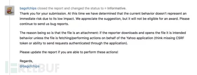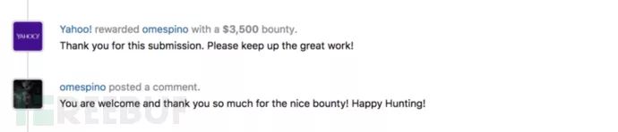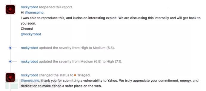 我匆匆忙忙地上报了这个漏洞,以下是雅虎安全团队人员在HackerOne上给我的回应: