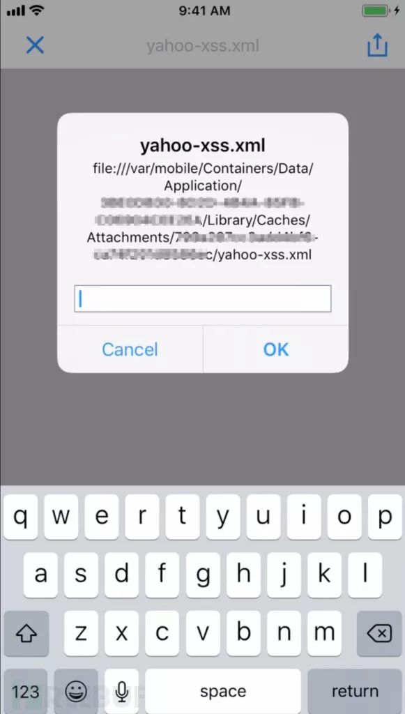 用雅虎邮箱iOS客户端(Yahoo! Mail iOS APP),进入你的收件测试雅虎邮箱,查看 yahoo-xss.xml 附件,打开它,看看是否有XSS反应。结果是当然有的,会吓了你一跳。如下: