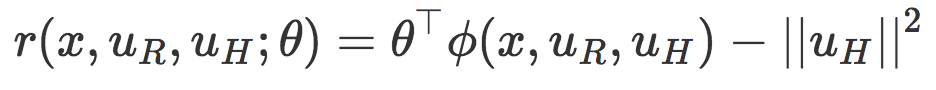 这里,ϕ(x,uR,uH) 对任务相关的特征进行编码(例如,「到桌子的距离」、「到人类的距离」、「到目标的距离」),θ决定每种特征的相对权重。这个函数中,θ封装了真正的目标——如果机器人准确地知道如何给任务的各个方面进行加权,那么它就可以计算出如何以最佳的方式执行任务。然而,机器人并不知道这个参数!机器人并不总会知道执行任务的正确方式,更不用说人类喜欢的方式了。