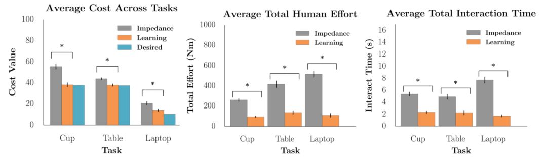 图 3 . 对于每一个目标测量(包括任务代价、人类努力以及交互时间),从交互中学习显著地优于不进行学习的情况。